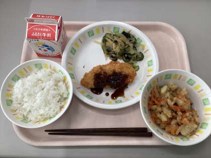 今日の給食は、ごはん、牛乳、魚のフライ、大根サラダ、きんぴら煮です。