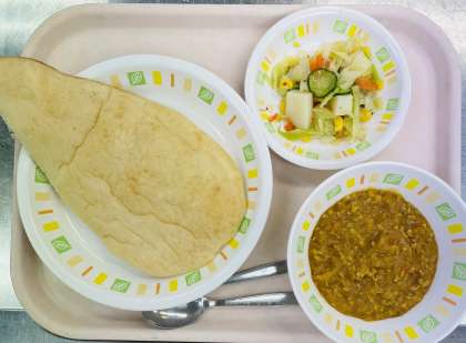 今日の給食は、ナン、牛乳、キーマカレー、ポテト入りフレンチサラダです。