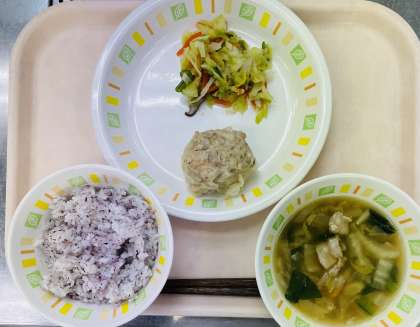 今日の給食は、ゆかりごはん、牛乳、ジャンボしゅうまい、野菜炒め、中華スープです。