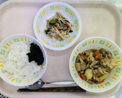 今日の給食は、ごはん、海苔の佃煮、牛乳、鶏肉とじゃがいものうま煮、野菜のからし醤油かけです。