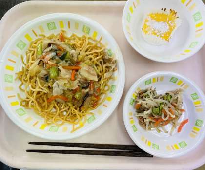 今日の給食は、炒めそば五目あんかけ、牛乳、ハム入り中華サラダ、かぼちゃのチーズケーキです。