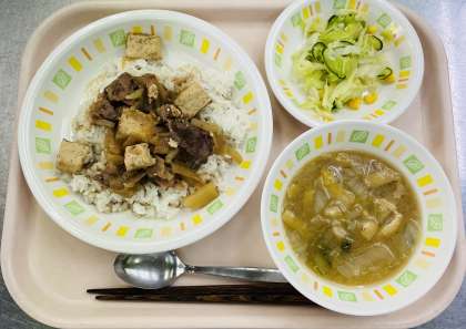 今日の給食は、牛丼、牛乳、コーン入りフレンチサラダ、みそ汁です。