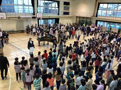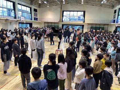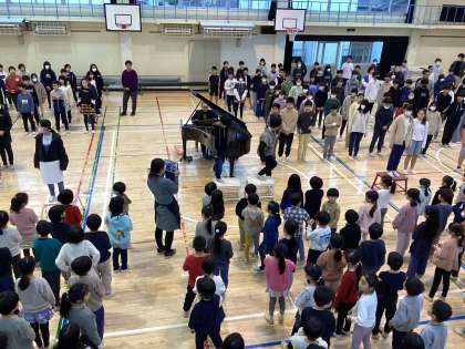 天候が悪かったため、公開なしになりました。体育館での集会です。