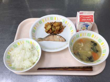 今日の給食は、ごはん 牛乳 鮭の塩焼き じゃがいものきんぴら炒め 誤汁