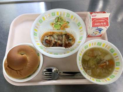 今日の給食は、黒砂糖パン 牛乳 魚のピザ風 フレンチサラダ 白いんげんの田舎風スープ