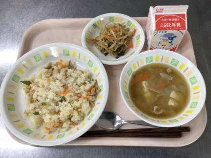 今日の給食は、小ぎつねごはん 牛乳 野菜のごまだれかけ 豚汁