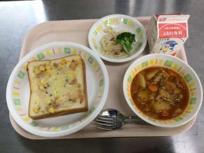 今日の給食は、ツナコーンチーズトースト 牛乳 ボルシチ 野菜のイタリアンドレッシングかけ