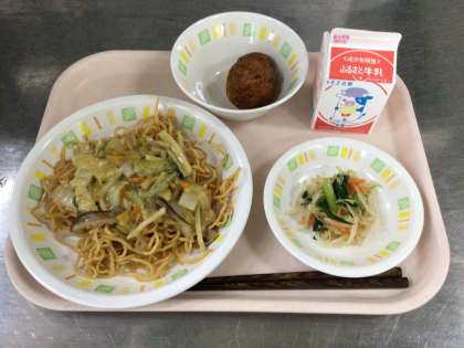 今日の給食は、五目あんかけそば 牛乳 塩ナムル サーターアンダギー