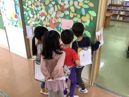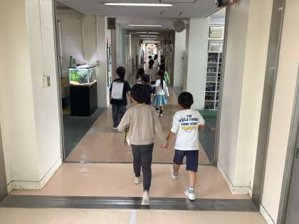 1・2時間目に学校探検を行いました。2年生が1年生を案内します。1年生の手を引き、クイズを出しながら楽しげに歩く姿が見られました。