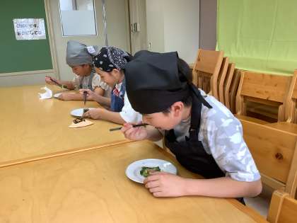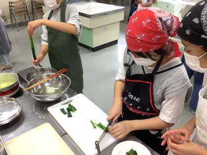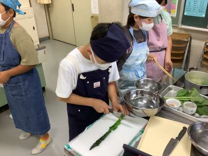 5年生の調理実習の様子です。初めて使う包丁に緊張しながらも、「ほうれん草のおひたし」を美味しく調理することができました。