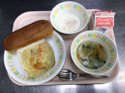 今日の給食は、黒砂糖パン 牛乳 豆乳入りポテトグラタン 野菜スープ フルーツヨーグルト