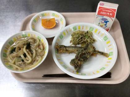 今日の給食は、きつねうどん 牛乳 ししゃもの天ぷら ちくわの磯辺揚げ キャベツの乾物あえ セミノール