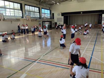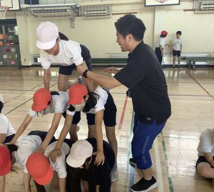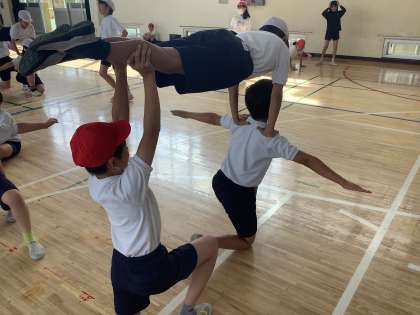 組体操の練習風景です。皆で息を合わせてダイナミックな演技ができるよう、細かいところまで確認しながら練習をしています。