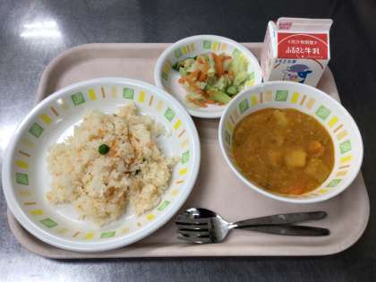 今日の給食は、キャロットライス 牛乳 ハンガリアンシチュー アスパラガスのサラダ