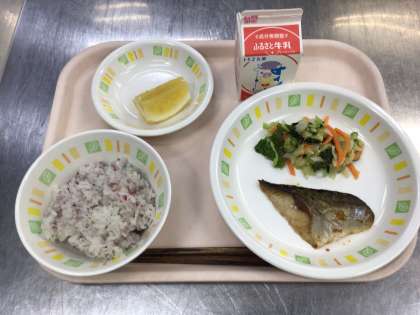今日の夜給食は、ゆかりごはん 牛乳 魚のしょうが風味焼き 春野菜とわかめのサラダ そばかす晩柑
