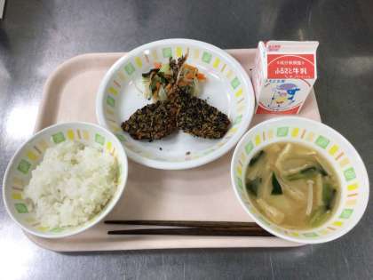 今日の給食は、ごはん 牛乳 魚のごまフライ 野菜の和風ドレッシング みそ汁