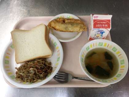 今日の給食は、セルフ焼きそばサンド 牛乳 魚とチーズのパリッと揚げ ベーコンと野菜のスープ