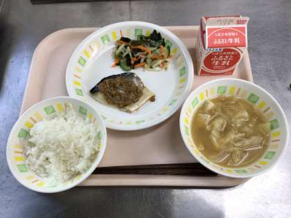 今日の給食は、ごはん 牛乳 魚のごまだれかけ 和風サラダ みそ汁