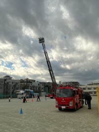 河口湖の湖畔と避難訓練の様子です。