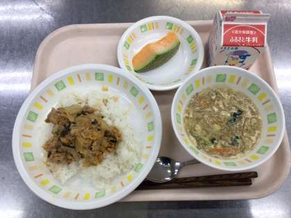 今日の給食は、キムチ丼 牛乳 卵入り春雨スープ メロン