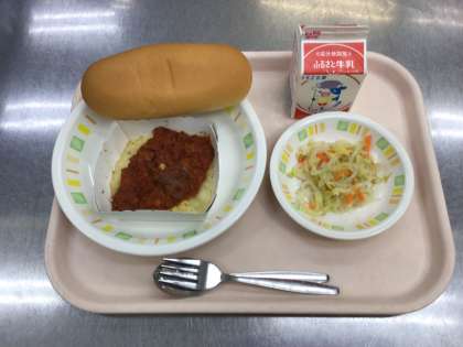 今日の給食は、国産小麦粉コッペパン 牛乳 チーズ入りシェパーズパイ キャベツサラダ