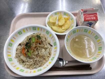 今日の給食は、ビビンバ 牛乳 フライドポテト 鶏と冬瓜のスープ