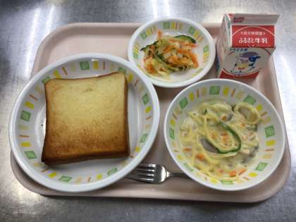 今日の給食は、シュガートースト 牛乳 シシリアン 野菜のイタリアンドレッシングかけ