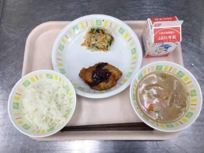 今日の給食は、ごはん 牛乳 チキンカツ わかめサラダ 豚汁