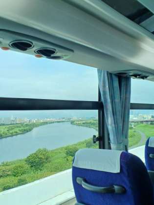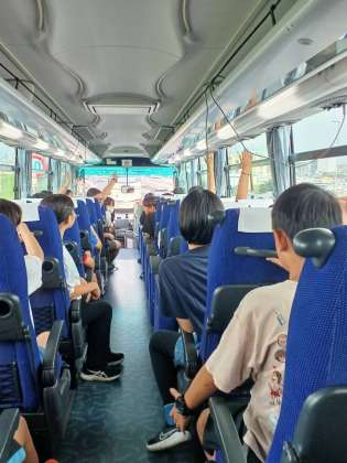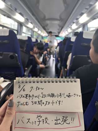 バスの中の様子です。荒川を超えたところですが、レクリエーションなどを行い楽しく過ごしています。
