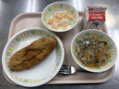 今日の給食は、あげパン 牛乳 春雨スープ フルーツヨーグルトかけ