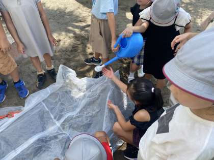 雨が降り、水が流れる様子を、砂場でモデルを作って観察しました。