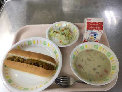 今日の給食は、ドライカレーサンド 牛乳 クリームスープ たまねぎドレッシングのサラダ