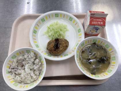 今日の給食は、ゆかりごはん 牛乳 コロッケ ゆでキャベツ みそ汁