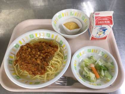 今日の給食は、スパゲッティミートソース 牛乳 ピクルス キャロットケーキ