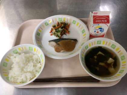 今日の給食は、ごはん 牛乳 魚のみそだれかけ 白菜と小松葉ののりあえ すまし汁