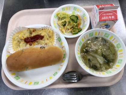 今日の給食は、ぶどうパン 牛乳 スペイン風オムレツ にんじんドレッシングサラダ 白菜のスープ