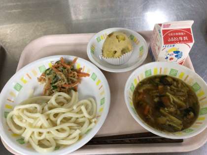 今日の給食は、カレーつけうどん 牛乳 もやしのごまあえ さつまいも入り蒸しパン