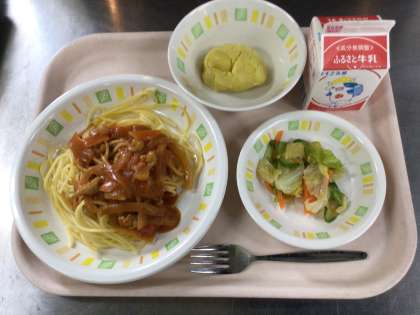 今日の給食は、スパゲッティ地中海ソース 牛乳 イタリアンサラダ スイートポテト