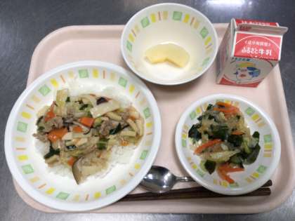 今日の給食は、中華丼 牛乳 春雨サラダ りんご