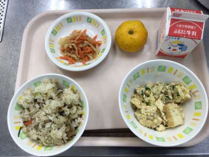 今日の給食は、シンジューシー 牛乳 マーミナーチャンプルー ツナ入リシリシリ みかん