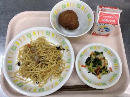 今日の給食は、塩焼きそば 牛乳 野菜の中華かけ 黒糖ごまドーナッツ