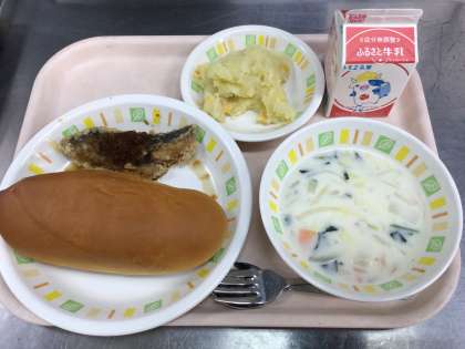 今日の給食は、ミルクパン 牛乳 魚のバーベキューソース コーンポテト 白菜のミルクスープ