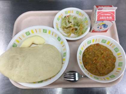 今日の給食は、ナン 牛乳 キーマカレー パリパリサラダ くだもの