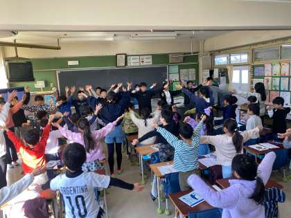 モジュール学習の時間を使い、1年生に「あいさつは魔法のことば」の振り付けを教えました。