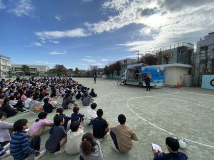 地震を想定した避難訓練を全校で実施しました。その後4年生は起震車に乗り、震度7の地震を経験しました。