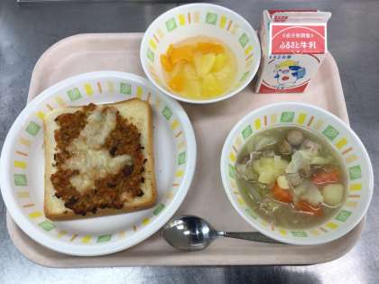 今日の給食は、ミートチーズトースト 牛乳 ポトフ フルーツポンチ