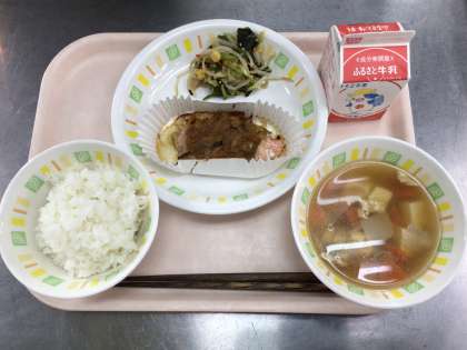 今日の給食は、ごはん 牛乳 鮭のチャンチャン焼き もやしとわかめのサラダ けんちん汁