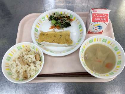 今日の給食は、こぎつねごはん 牛乳 千種焼き おひたし 粕汁