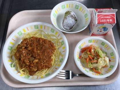 今日の給食は、スパゲッティミートソース 牛乳 フレンチサラダ グリーンケーキ