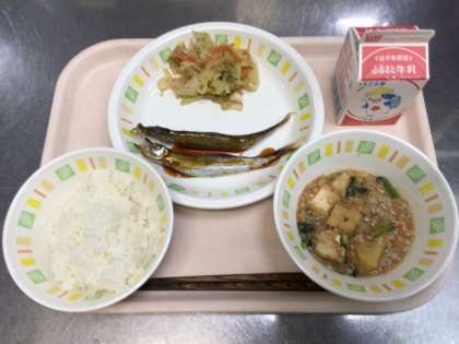 今日の給食は、ごはん 牛乳 焼きししゃもの甘辛だれ ごま酢かけ 生揚げそぼろあんかけ